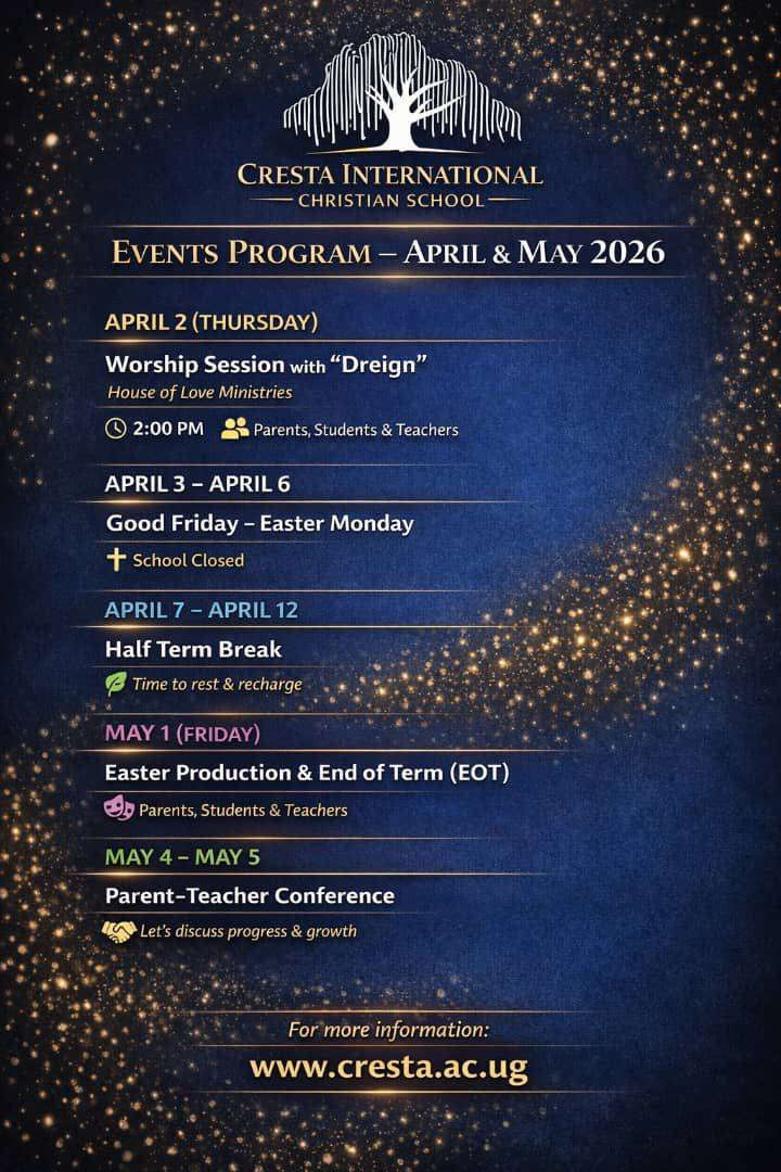 Thursday, 2 April 2026 Worship Session with Dreign House of Love Ministries Time: 2:00 PM Parents, Students and Teachers Friday, 3 April to Monday, 6 April 2026 Good Friday to Easter Monday School Closed Tuesday, 7 April to Sunday, 12 April 2026 Half Term Break Friday,1 May 2026 Easter Production and End of Term Parents, Students and Teachers Monday,4 May to Tuesday, 5 May 2026 Parent Teacher Conference